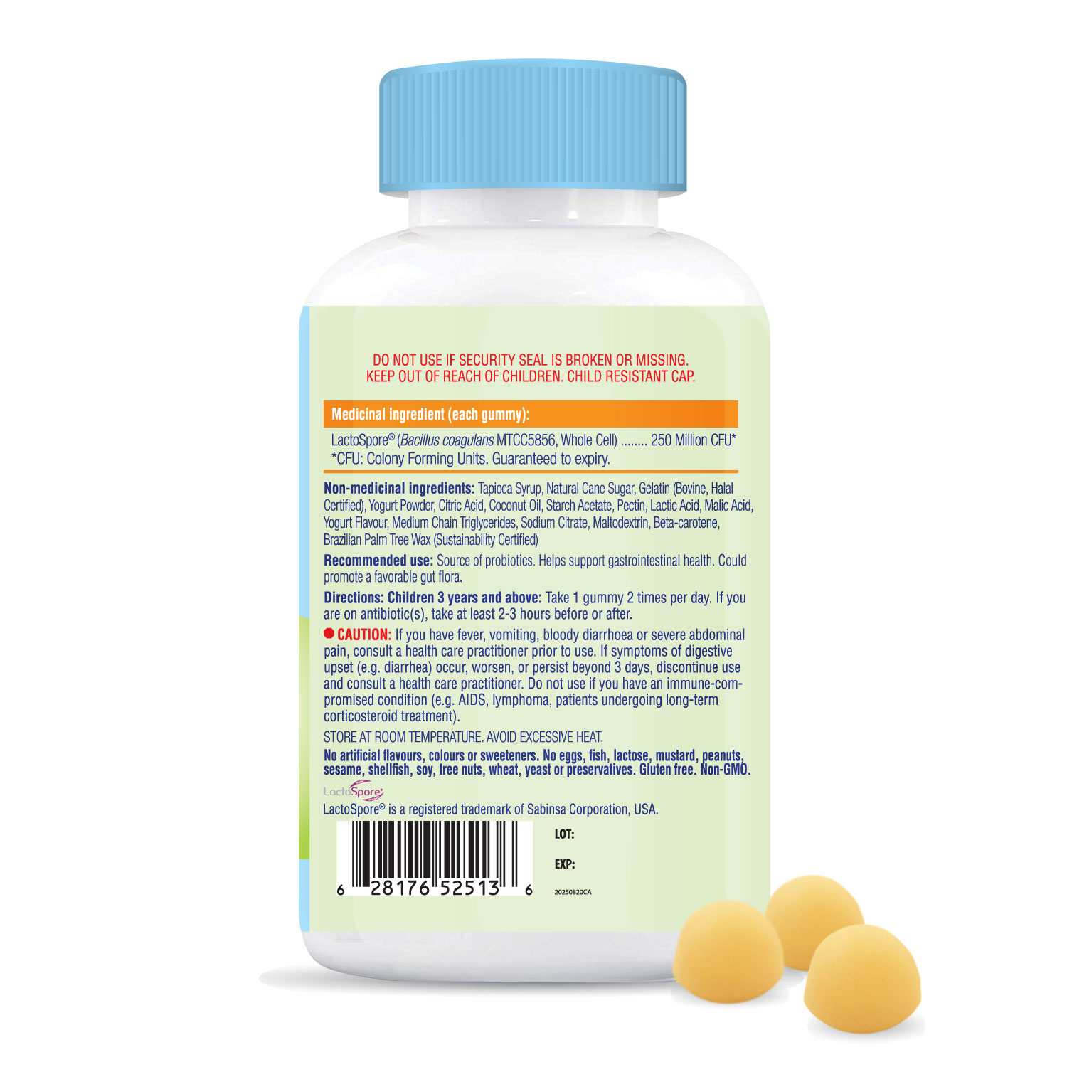 DAILY DIGESTIVE & IMMUNE HEALTH…featuring Bacillus coagulans LactoSpore®, the clinically validated & Non-GMO Project verified probiotic that could support digestive health and immune health in kids. This trademarked & patented strain has been extensively studied to show its supportive role in managing immune system, irritable bowel condition, and acute diarrhea in children. Each serving (2 gummies) is formulated with at least 500 million live, active friendly probiotic cells that remain stable at room temperature